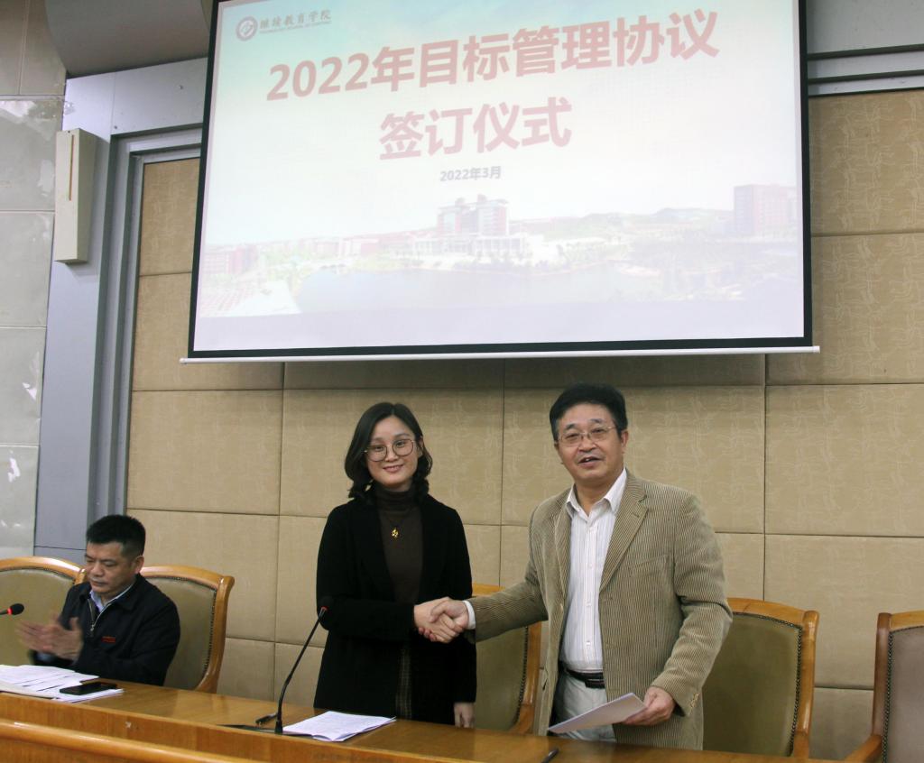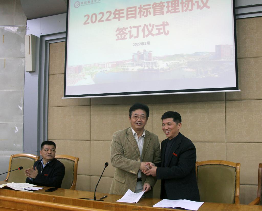 会上,学院各部门负责人与邹兴平签订了《部门目标管理协议书》。成教部主任何华、学籍学位与技术服务部主任张静、培训部负责人陈道军、后勤部负责人谭秋民等代表发言,谈落实工作思路和举措,交流工作心得和感悟,纷纷表示要变压力为动力,实现部门和学院目标任务的顺利完成。