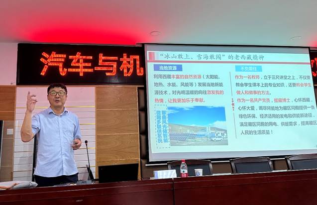 赵斌教授为首批全国高校黄大年式教学团队成员、同时也是中组部第17、18批援藏博士团成员,于2016年-2020年做援藏工作三年多。他为全体教职工作题为《基于“老西藏精神”的“双碳时代”大学生实践创新培养》的辅导报告。报告中他给大家分享了“老西藏精神”的丰富内涵,在援藏工作中将“特别能吃苦、特别能战斗、特别能忍耐、特别能团结、特别能奉献”的“老西藏精神”用于实践工作中,在青藏高原恶劣自然条件下,哪怕身体有不适,都要咬牙坚持,发扬“冰山敢上、雪海敢闯”的老西藏精神,不畏艰险,不言放弃。同时在从事高等教育的工作中,不忘磨砺己身,为党育人。在工作中,他的“12字精神”让老师们感触很深:“努力到无能为力、学习到筋疲力尽、拼搏到感动自己”。他说,在教书育人的过程中,要善于发现第一个学生的闪光点和特长,要欣赏学生、爱护学生、懂得学生,将正能量传递给学生们,同时激发青年学生在新时代、新使命下的青年担当,在教学中要厚植实践沃土,培养创新人才,以学促用,要做青年人成长的领航人。