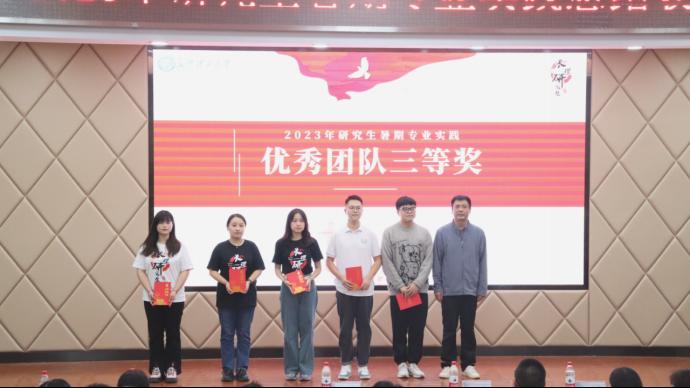 在欢快的乐曲声中,各位与会领导为30支暑期实践优秀团队颁布奖项。本次表彰大会共诞生了6支一等奖团队、9支二等奖团队和15支三等奖团队,获得优秀团队一等奖的6支团队依次上台分享他们的实践成果,丰富的成果和精心的演讲收获了现场的阵阵掌声。