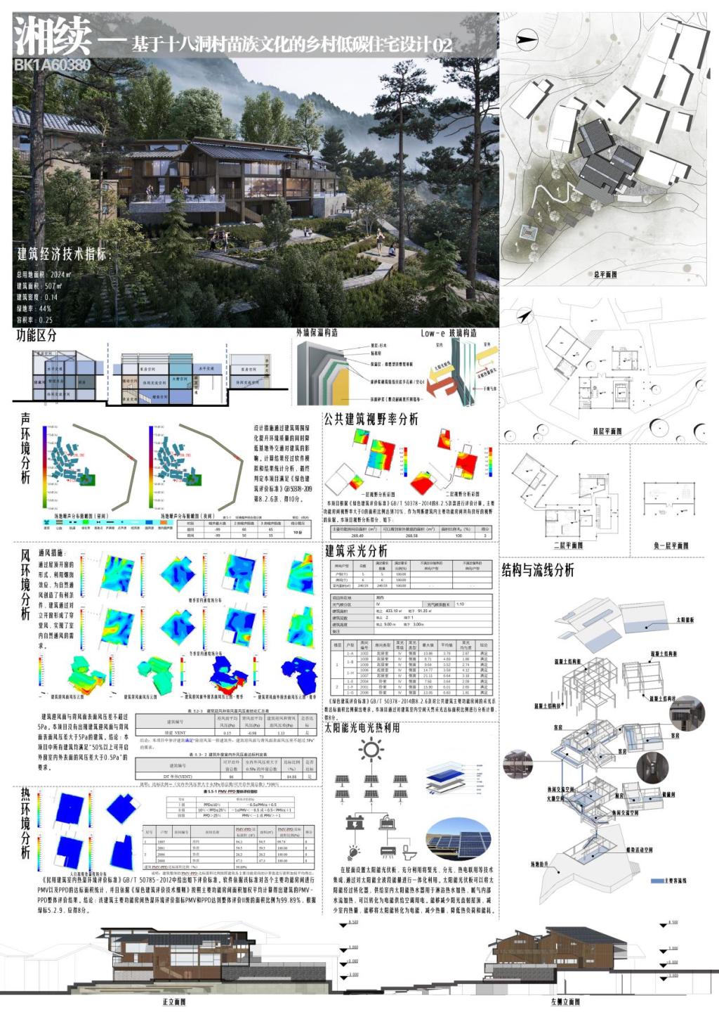 获奖项目“湘续-基于十八洞村苗族文化的乡村低碳住宅设计”选址于湖南省湘西土家族苗族自治州十八洞村,该村具有独特的苗族文化,在这样的情境场域里,充分感知梯田地形景观,对其集约分类,依托景观面营造体验式游廊空间,充分展现十八洞村的独特地域风情;在建筑设计上,坚持以融入传统建筑聚落肌理为原则,将新建建筑以分散式布局形式融入既有建筑群,对当地传统民居空间及构造类型进行归纳提炼,以游客的情境体验引领高质量的物理环境营造,通过空间、构造、材料多层次集成绿色建筑技术,将湘西人文与自然融入现代高质量绿色民宿设计;同时,在运营策略上依托苗族特有的蜡染传统民间工艺组织的体验活动,在展现苗家风情、增加用户粘性的同时,给当地居民脱贫创收增加有效渠道,让居民与游客在共享民宿这一新质生产力的引领下享受美好生活。项目伊始,团队就第一时间赴十八洞村及周边村寨实地调研:发掘苗族山寨的空间特性,重温承载的湘西文化记忆。在梳理整合调研与线上资料的基础上,解析十八洞村传统民居的优点与不足。设计坚持保护原有生态的理念,以微介入的方式优化空间组织,在绿建专业软件斯维尔的辅助下计算、优化、评估绿建技术对于节能与舒适的有效性,提升传统民居的品质。