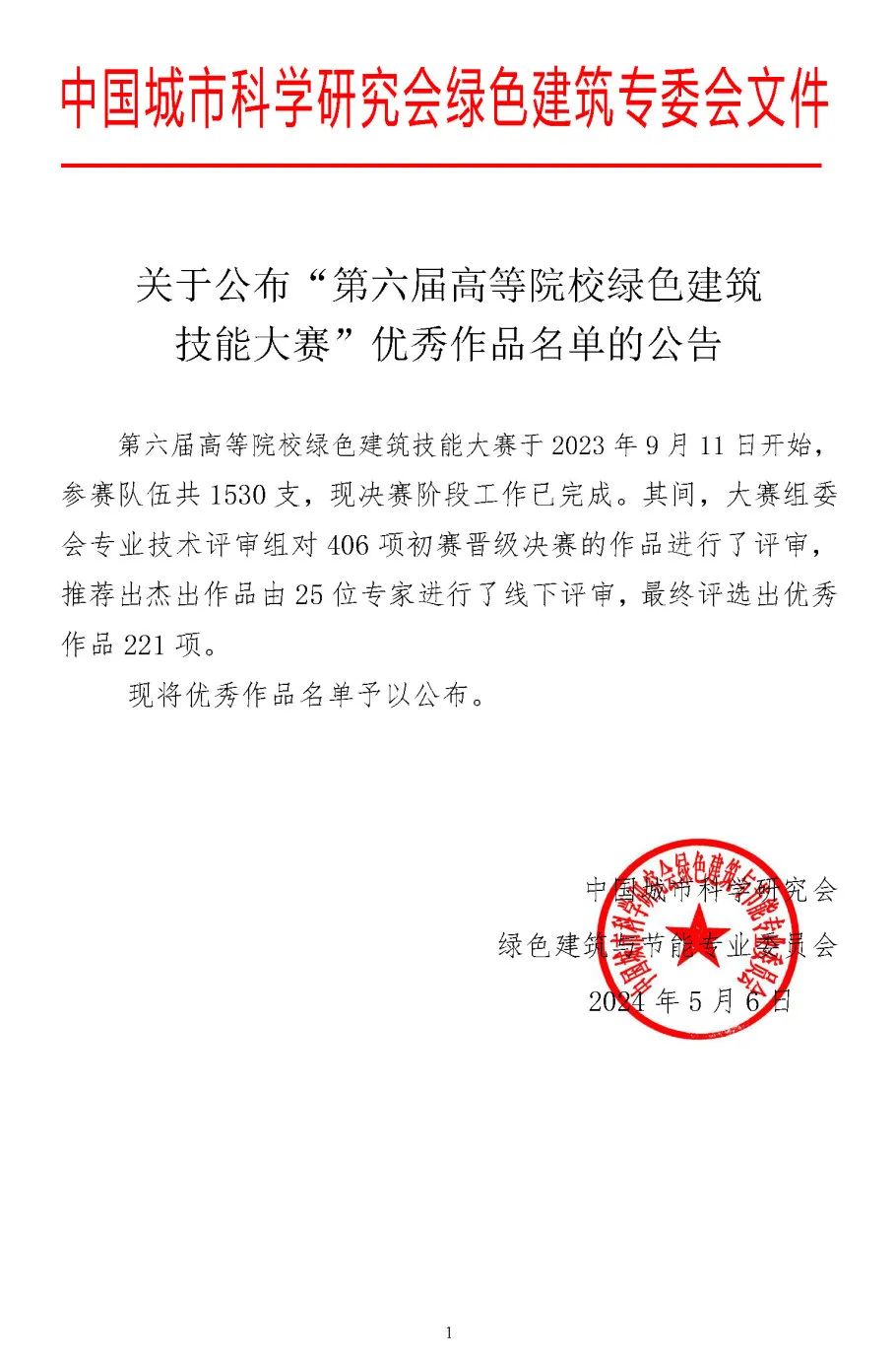 绿色建筑技能大赛是在《“十四五”建筑节能与绿色建筑发展规划》中提出“基本形成绿色、低碳、循环的建设发展方式,为城乡建设领域2030年前碳达峰奠定坚实基础”的总体目标,结合教育部发布的《加强碳达峰碳中和高等教育人才培养体系建设工作方案》要求,提高“双碳”目标下绿色建筑人才培养质量的背景下举办的赛事。第六届高等院校绿色建筑技能大赛自2023年9月11日报名开始,参赛队伍共1530支,大赛组委会专业技术评审组对406项初赛晋级决赛的作品进行了评审,推荐出杰出作品由25位专家进行了线下评审,最终评选出优秀作品221项。