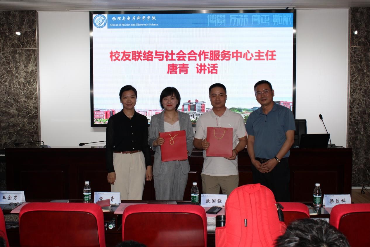 6月5日下午,物电学院在理科楼B413举办“物电之光”校友论坛暨校友“回湘创业”报告会,会议由学院党委副书记宋国宁主持,校友联络与社会合作服务中心主任唐青、学院党委书记张国强,校友梁益科(湖南鑫湘源科技有限公司总经理),校友王金男(中国银行开福支行营业部主任)参加本次论坛。