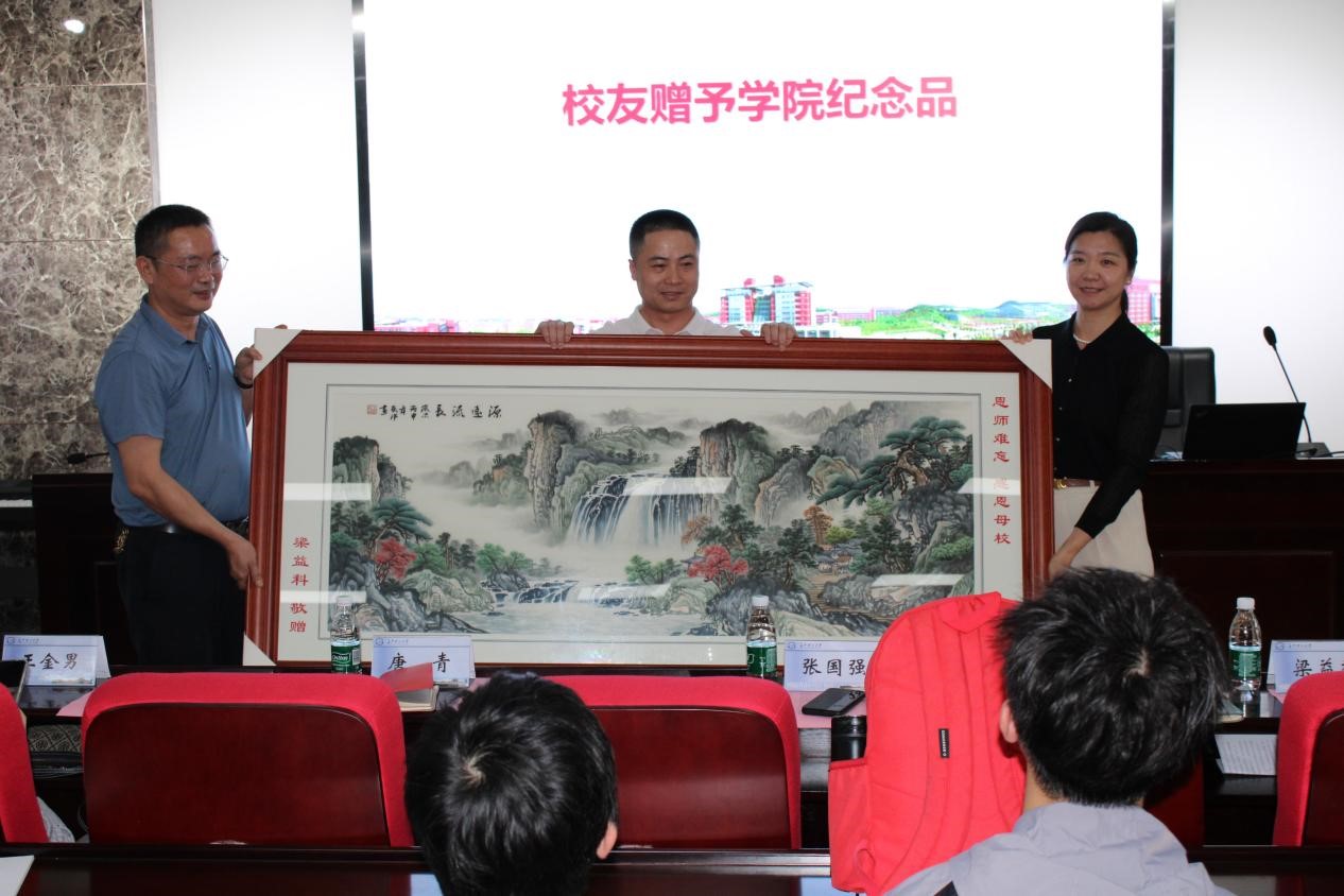 报告会之前,校友梁益科赠予学院纪念品,表达了对学院一份深情厚谊,并进行合影留念。