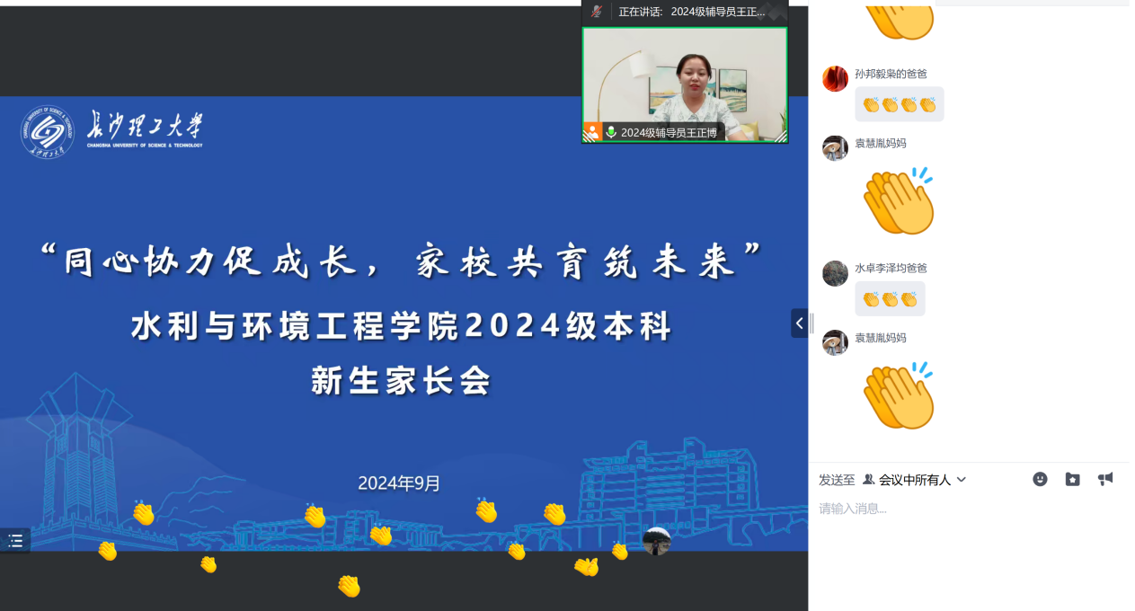 为进一步强化家校联动,凝聚育人合力。水利学院于9月13日召开线上2024级本科新生家长会。学院党委书记喻玲娜、院长陈杰、院党委副书记银波、2024级新生辅导员王正博、李永睿,来自全国各地的700余名新生家长参会,会议由王正博主持。