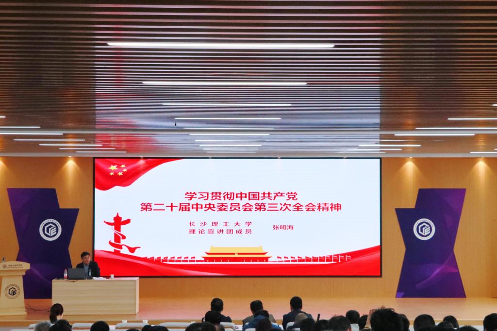 张明海从深刻认识和把握这次全会精神,深入学习领会习近平总书记在党的二十届三中全会上的重要讲话精神,党的二十届三中全会对教育、科技、人才提出了新要求、新任务,进一步全面深化改革是建设高等教育强省的必由之路,进一步全面深化改革、奋力书就高等教育高质量发展的“长理新篇章”等五个方面,对党的二十届三中全会精神进行了深入系统解读。