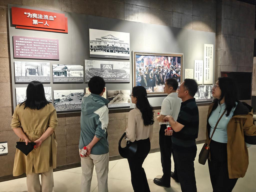 在讲解员引导下,全体人员依次参观了黄兴生平事迹陈列馆、辛亥革命史迹展等核心展区。一件件斑驳的文物、一封封泛黄的手札,生动再现了黄兴先生“无我、笃实”的革命精神。在黄兴书斋复原场景前,教师们驻足聆听“投笔从戎”的典故;于辛亥革命武昌起义浮雕墙下,党员们重温“敢为人先”的湖湘精神。