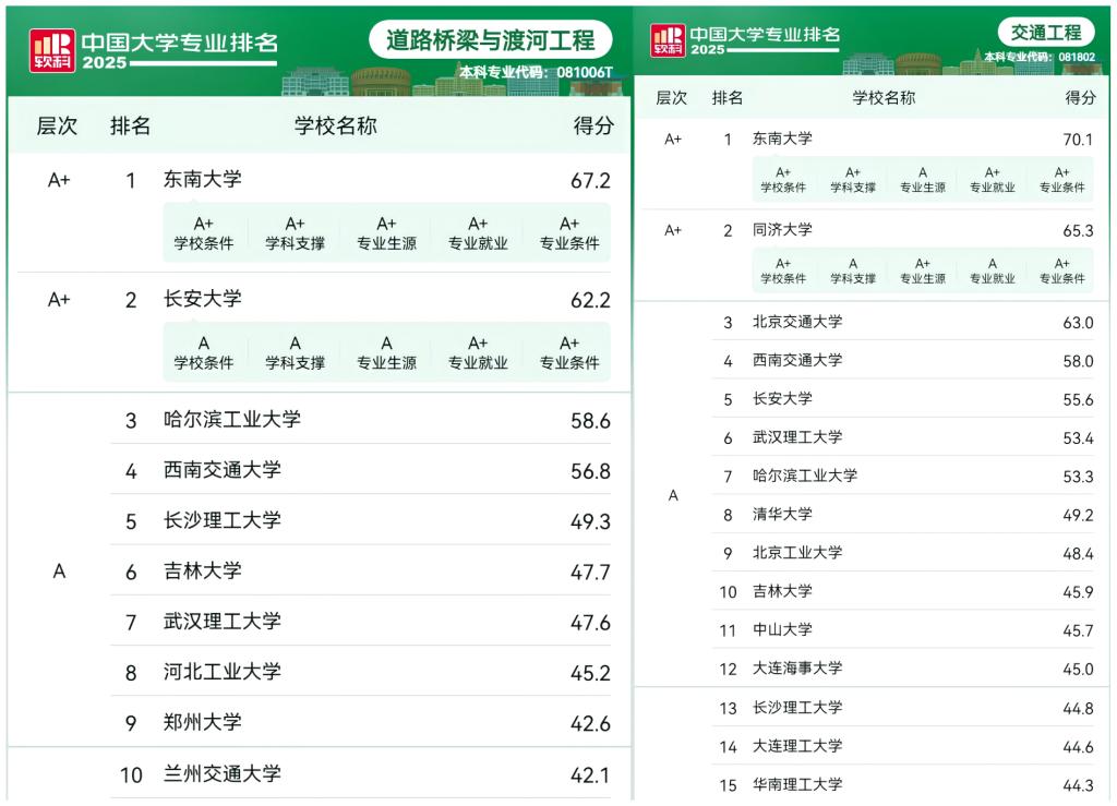 近日,高等教育评价机构软科正式发布《2025软科中国大学专业排名》。交通学院多个专业表现亮眼,其中道路桥梁与渡河工程专业位列全国高校第5名,物流工程专业排名全国高校第10名,交通运输与交通工程专业均位居全国高校第13名,工程管理专业位列全国高校第64名(参评高校共221所)。