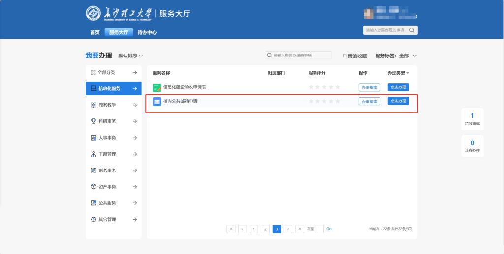 (2)部门邮箱:部门公共邮箱申请使用请在服务大厅/信息化服务/校内公共邮箱申请,具体操作如下。