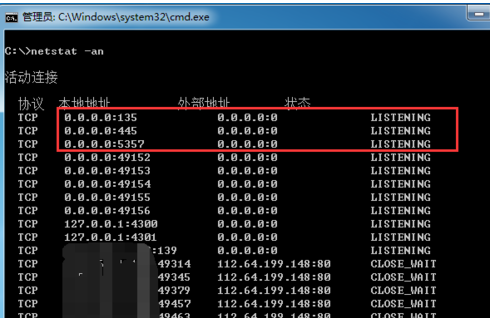 可发现当前系统开放了135、445以及5357端口,状态处于监听状态“Listening”;