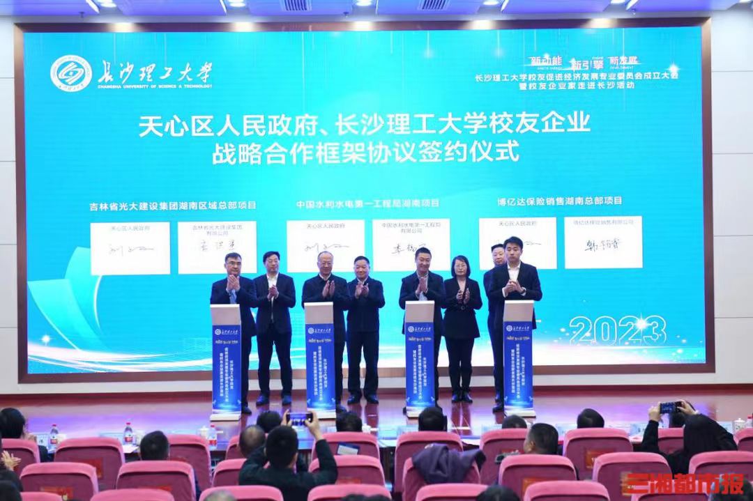 此外,大会宣读了云顶国际vip8866校友促进经济发展专业委员会成立文件,选举了组织机构成员,表决通过了相关管理办法,万里交科集团德通智能科技股份有限公司董事长张良奇担任校友促进经济发展专业委员会主任。云顶国际vip8866、天心区政府签订校地人才战略合作框架协议;中国水利水电第一工程局有限公司、吉林省光大建设集团有限公司及博亿达保险销售有限公司三家长理校友企业与天心区政府签订战略合作框架协议。