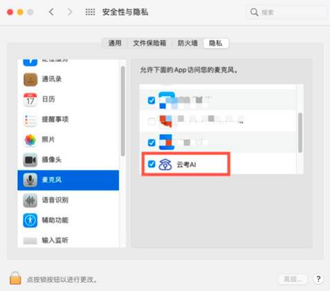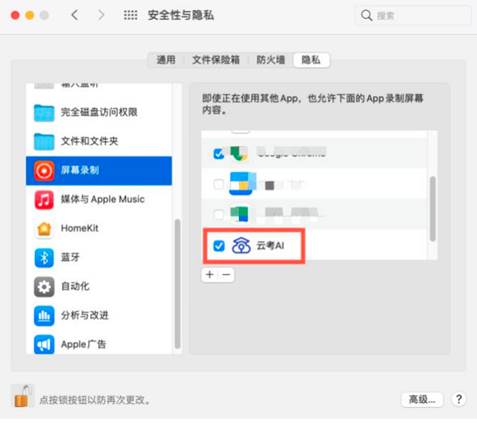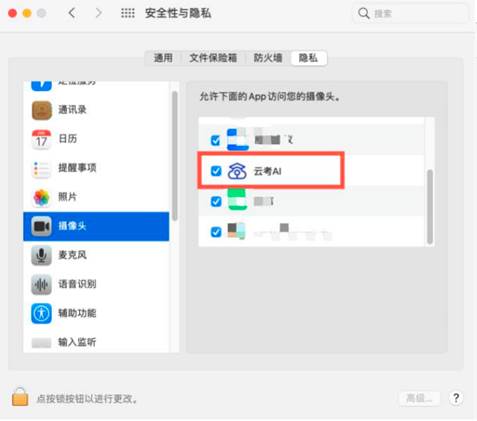 (4)若使用Mac电脑参加考试时若出现音视频问题或无法共享屏幕,请在“安全性与隐私”中检查是否为云考AI开启摄像头、麦克风及屏幕录制权限