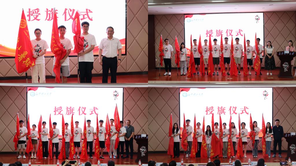 会上,与会领导为研究生暑期专业实践团队授旗。