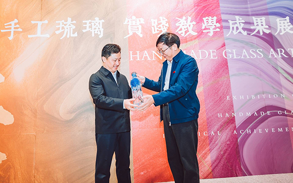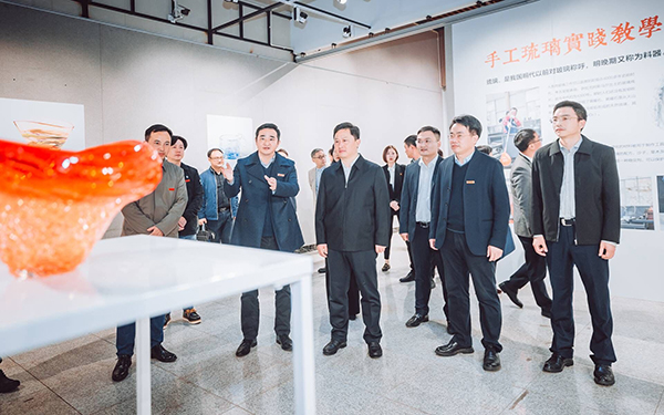 李志超一行首先在设计艺术学院一楼展厅参观了“火舞”主题手工琉璃实践教学成果展,该院院长王健引导讲解。王健介绍道,本次展出的近50件作品,是学院师生在山东博山实习基地运用玻璃吹制技术完成的琉璃作品,并简要介绍了学院发展概况、特色优势和综合改革情况。