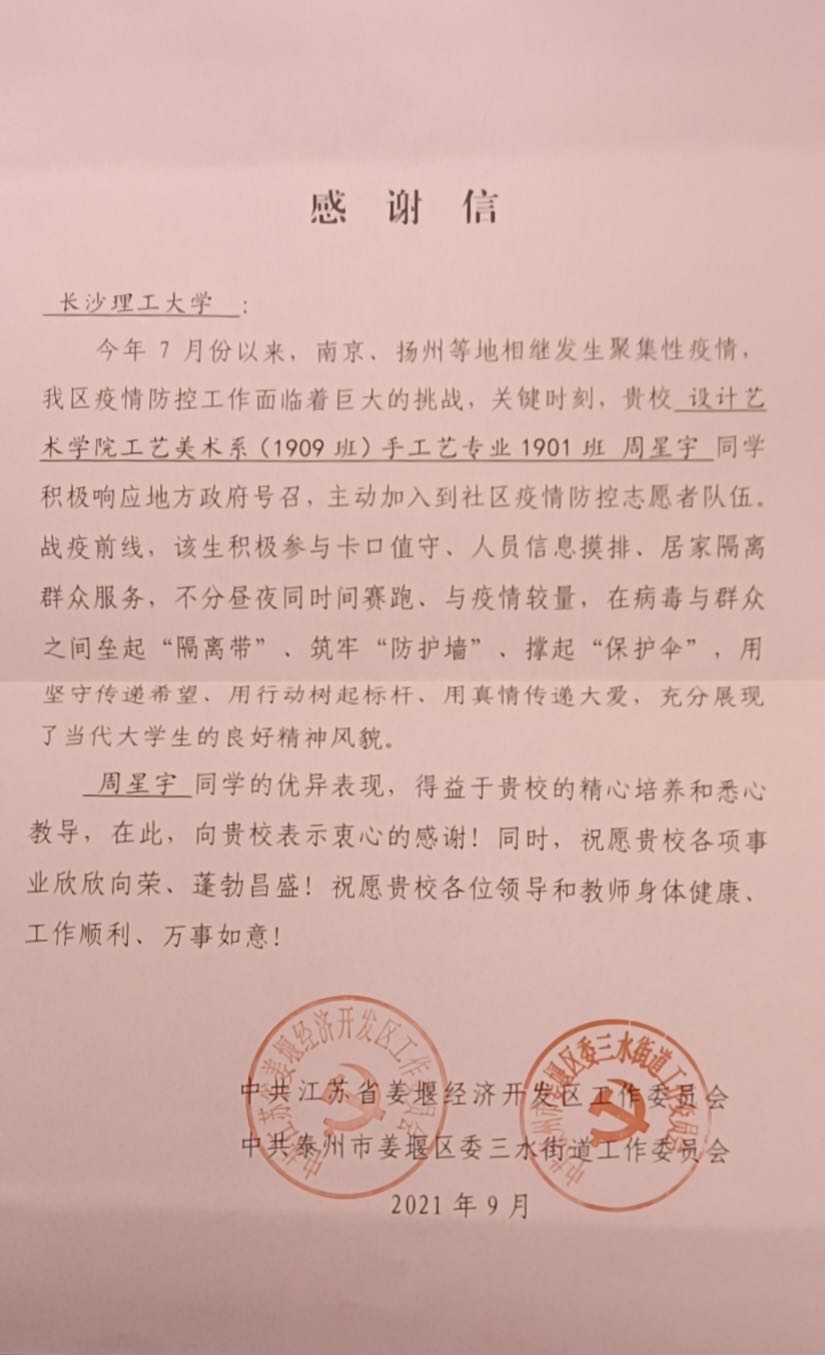 “今年7月份以来,南京、扬州等地相继发生聚集性疫情,我区疫情防控工作面临着巨大的挑战,关键时刻,贵校设计艺术学院工艺美术系(1909班)手工艺专业1901班周星宇同学积极响应地方政府号召,主动加入到社区疫情防控志愿者队伍。战疫前线,该生积极参与卡口值守、人员信息摸排、居家隔离群众服务,不分昼夜同时间赛跑、与疫情较量,在病毒与群中之间垒起‘隔离带’、筑牢‘防护墙’、撑起‘保护伞’,用坚守传递希望、用行动树起标杆、用真情传递大爱,充分展现了当代大学生的良好精神风貌。”9月7日,云顶国际vip8866收到了这封由中共江苏省姜堰经济开发区工作委员会、中共泰州市姜堰区委三水街道工作委员会发来的感谢信。