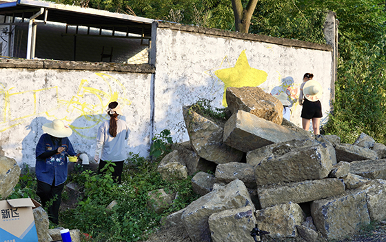 下午,实践团兵分两路前往坪山小学和指定道路两侧的墙面进行主题墙绘。从粉笔打底、绘画布局、调色粉刷,再到细节修饰,实践团成员们用心设计、认真对待每个环节。成员们不畏高温日晒,以饱满的热情全身心投入,展现了艺术学子吃苦耐劳、积极向上的良好精神风貌。沿着村道一路前行,道路两侧一群充满青春活力的艺术学子,正用手中的笔刷为这个古朴的村子留下了一道道令人赏心悦目的风景。