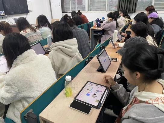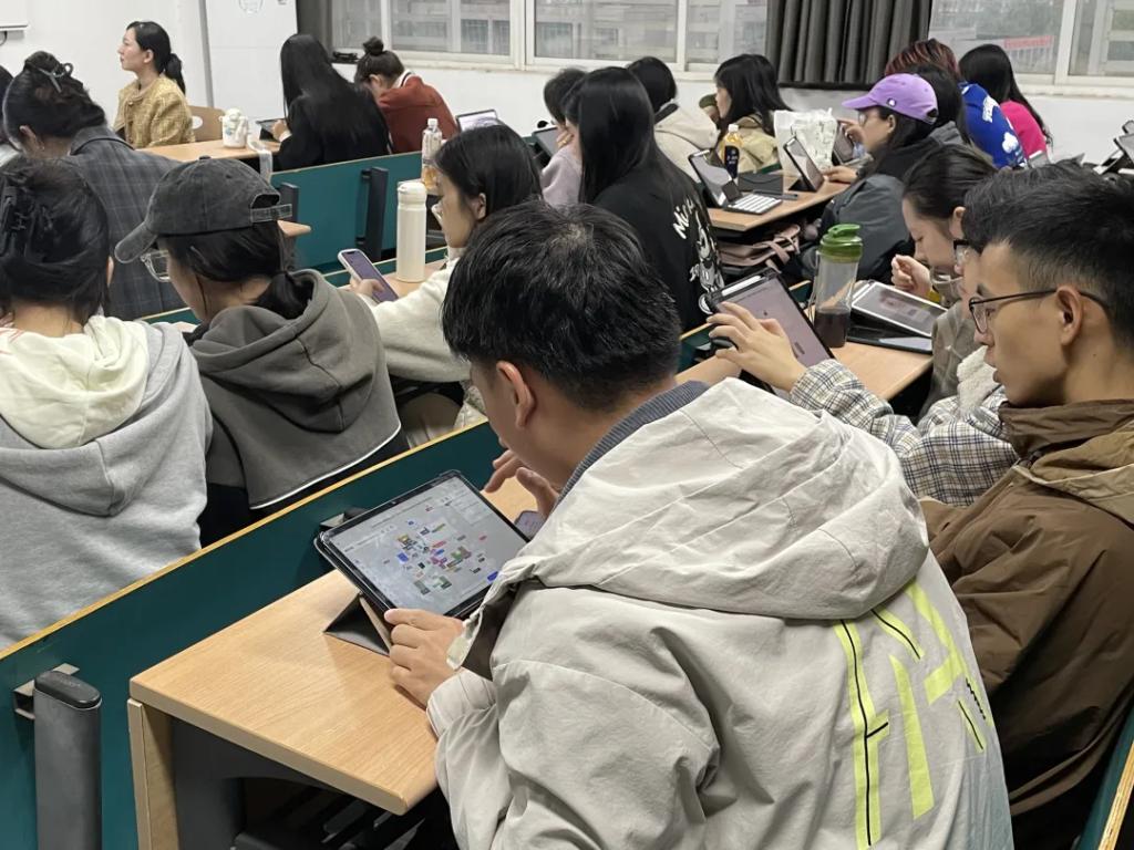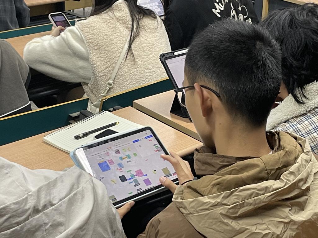 在app界面上可以看到带着名字的每个同学的光标在屏幕上同时移动,还可以看到其他同学的回答,有着良好的体验感和交互感。学生们大多都是第一次使用“Miro”app,感觉非常奇妙,现场氛围活跃。无论是线上还是线下的每位同学都参与其中,围绕老师提出的问题展开了热烈的讨论,积极踊跃地在学习平台中上自己的观点与想法。
