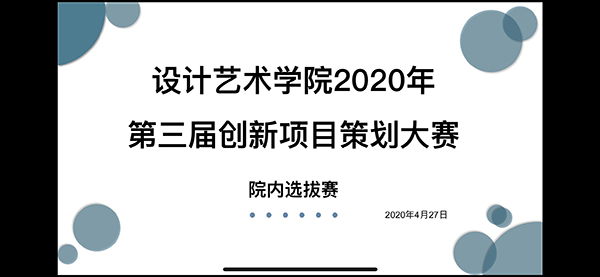 4月27日下午,设计艺术学院顺利开展第三届创新项目策划大赛院内线上选拔赛。创新创业学院常晗老师;校团委万馨老师;设计艺术学院团委书记李慧老师出席此次会议并担任评委。此次会议由第十一届团委学生会创新创业部陈锦舜主持。