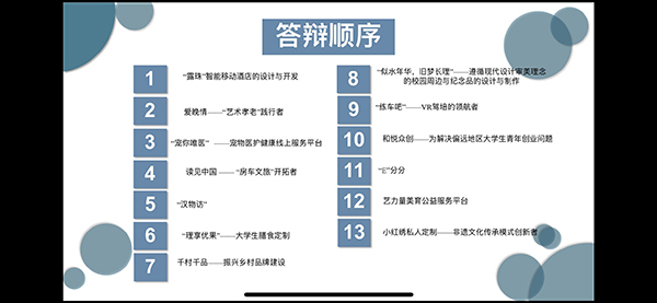 本次会议旨在增强学生创新意识以及团队意识,促进学生综合能力的提升。会议伊始,12位项目负责人依次提交项目策划书,并以PPT作为媒介进行项目介绍。介绍内容主要围绕市场背景、项目介绍、项目创新及人员构成这四个方面进行详细解说。随后,万馨老师为在场负责人详细介绍了“互联网+”的背景以及大赛的意义。对院内选拔赛项目的创意新颖提出了表扬,并对各个项目指出了其项目短板,小到项目吸引力大到项目的落地及前景规划。评委依据各项目负责人对问题的解说提出详细的指导性建议。常晗老师指出项目的创新性、可行性、市场发展前景是取胜的关键,并根据项目起源的“社会痛点”延伸出项目必备的六大重点。最后评委对各个项目做出了积极展望。