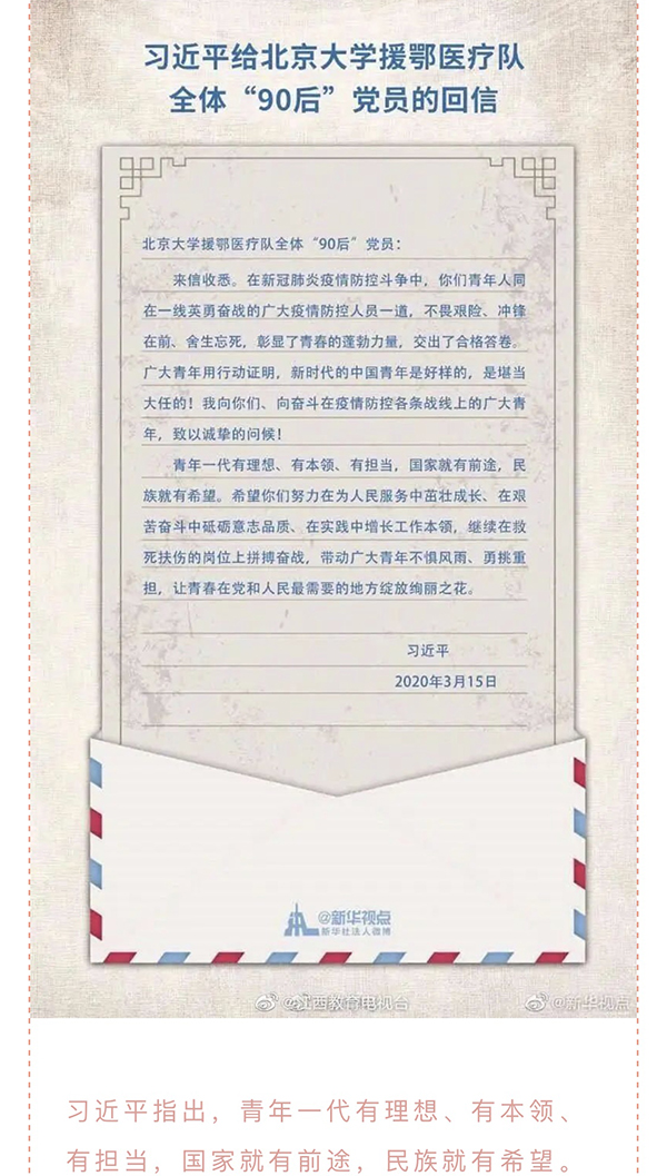 3月18日,设计艺术学院成功开展关于“习近平给北京大学援鄂医疗队全体‘90后’党员的回信”系列活动。本次活动由院团委学生会组织部承办,全体学生会成员参与活动。