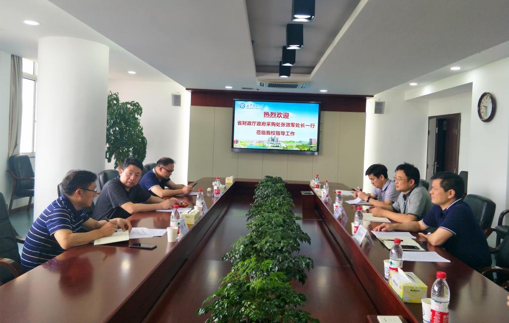 7月11日上午,省财政厅政府采购处处长张效军一行三人来云顶国际vip8866对政府采购工作情况进行调研,校党委副书记邹宏如,国有资产管理处处长庄创奇、副处长周娇林及采购管理科相关同志参加现场调研和座谈。