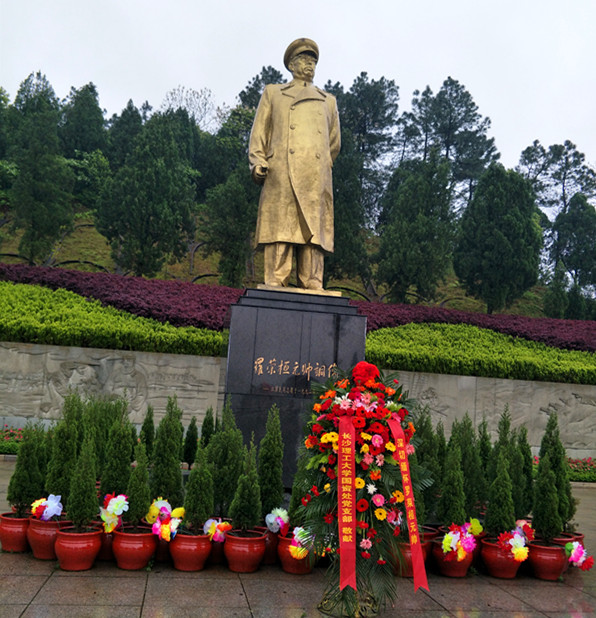 同志们首先到罗荣桓元帅铜像广场。广场占地面积80亩,共分为三级,铜像矗立于第三级广场的正中央。铜像座基上镌刻着由江泽民同志亲笔题写的"罗荣桓元帅铜像"。支部党员代表向罗帅铜像敬献了花篮,全体同志向罗帅铜像三鞠躬。