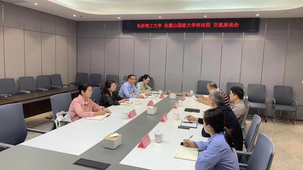 在岳麓山国家大学科技园科技服务有限公司,大科园公司总经理吴勤、副总经理李凌荣介绍了落实学校成果转化过程中园区资源匹配、法律咨询服务、搭建共享平台等方面的情况。双方就企业发展过程中存在的痛点难点问题展开深入探讨,共同探寻难题化解之道。