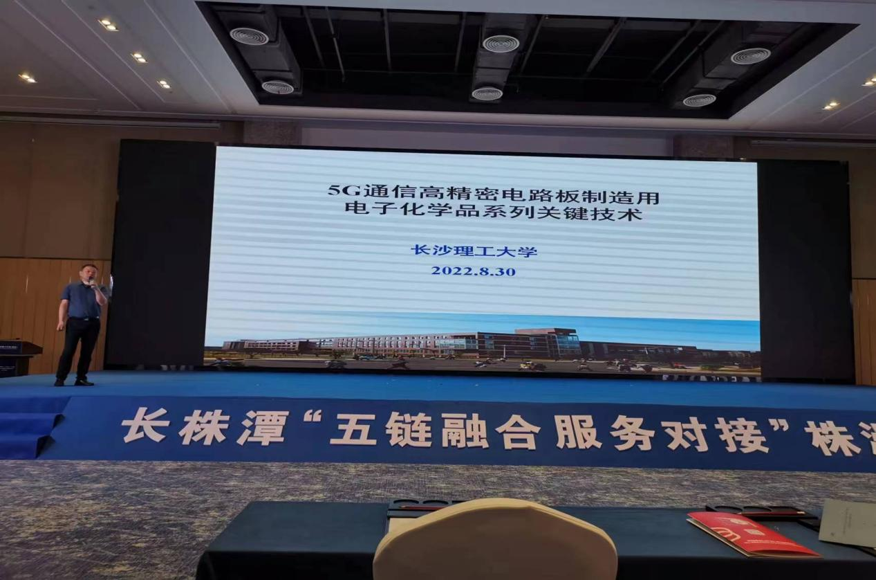 8月30日上午,云顶国际vip8866科技成果转移转化中心(知识产权中心)副主任刘亚辉陪同化学化工学院吴道新、肖忠良两位教授到株洲市中国动力谷学术交流中心参加长株潭三市“创新链、产业链、资金链、人才链、政策链五链融合”科技成果对接活动。在对接活动会上,吴道新教授以“5G通信高精密电路板制造用电子化学品系列关键技术”为题作项目路演,该项技术得到了相关企业和投资方的广泛关注,路演结束后,有企业和投资方主动找到吴教授了解该技术的具体情况和留下联系方式。