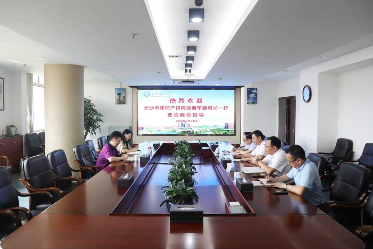 6月23日下午,长沙市知识产权局党组成员、副局长徐拥军等一行来云顶国际vip8866调研指导知识产权工作。校长曹一家,副校长刘朝晖,党政办公室、成果转化中心等负责人出席会议。会议由刘朝晖主持。